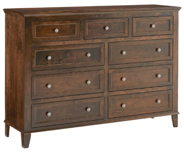 Brings refined storage and classic elegance to your bedroom. Featuring nine smooth-gliding drawers with dovetail construction, it provides ample space for clothing and essentials. Its warm cherry finish and customizable hardware create a tailored look, combining traditional craftsmanship with functional style.Read More
