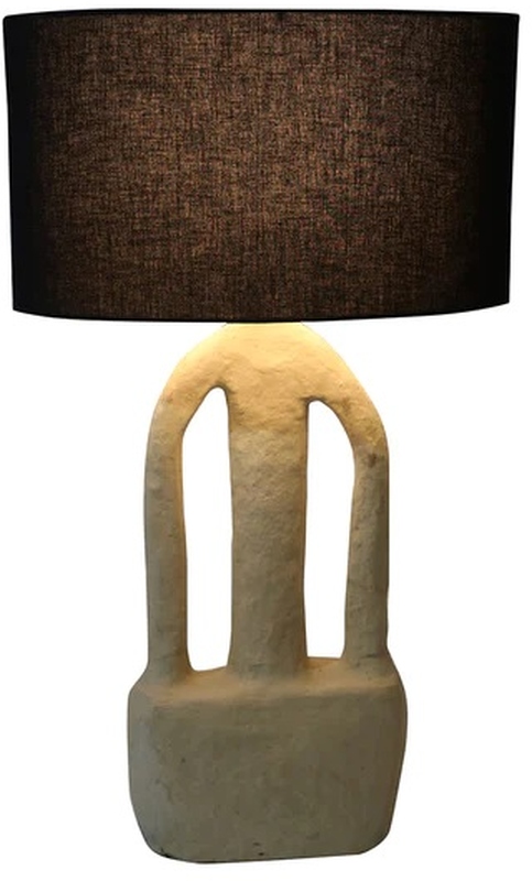 The paper mâche base is finished in an off-white hue that tops the recycled paper construction. The black shade measures 16" x 10" x 9" on this 26-inch-tall lamp. The shade of each Agadir Table Lamp varies slighly.