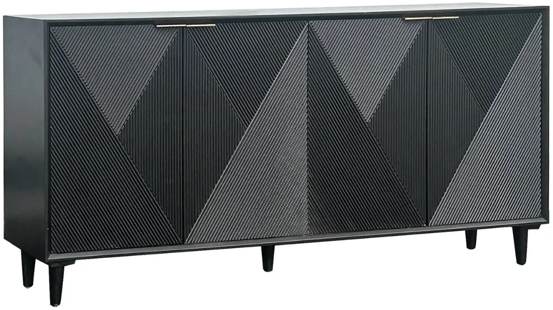 Elevate your space with this elegant media credenza/sideboard, crafted from acacia wood with pine veneer. Its black painted finish, enhanced with an oil coating, exudes timeless charm. Featuring four doors with striking diagonal detailing, upgraded European hinges, and sleek gold bar handles, it combines beauty and functionality.Read More