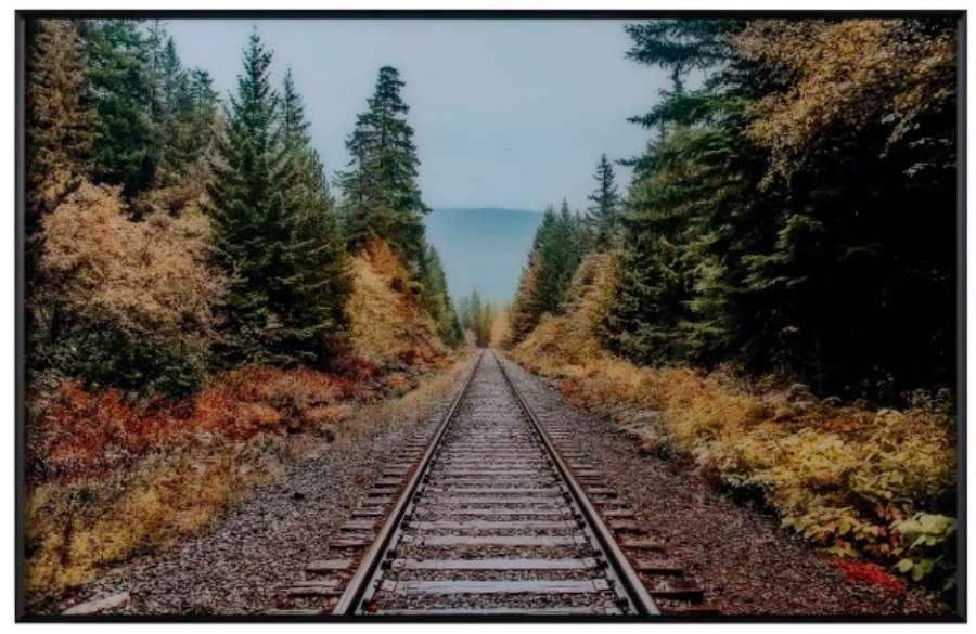 The rich colors of green, red, and orange leaves create a striking contrast against the dark trees and train tracks, making this print a captivating addition to any space. The railroad heading towards the distant mountains adds a sense of depth and adventure to the piece, making it feel like you are embarking on a journey through the stunning autumn landscape. The tempered glass adds depth and texture to the piece, making it feel like you can almost reach out and touch the leaves and trees. The sleek black frame adds a touch of sophistication and modernity to the piece, making it the perfect addition to any contemporary or traditional decor.
