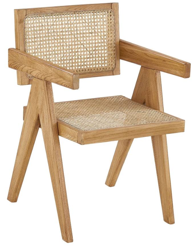 The Belle Chair brings both style and comfort to your home. Handcrafted from elm wood with tapered legs, its bold geometric shapes and squared-off arms contrast beautifully with the natural cane back and seat. A soft neutral finish highlights the wood's grain, while the sleek design keeps it simple yet striking.Read More