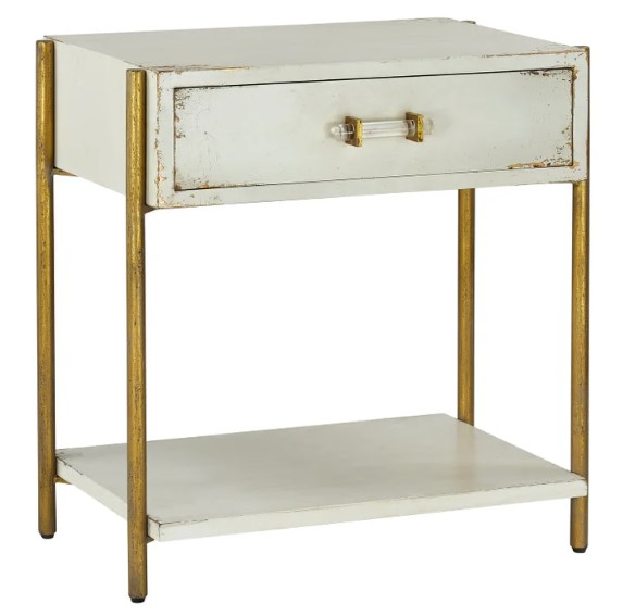 This chest incorporates a sense of elegance and class through the bright gold rods that travel along the sides. It has a slightly distressed white finish on the drawer and shelf to make a more homey feel.Read More