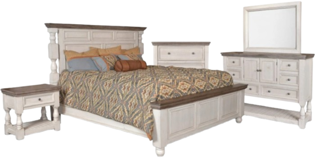Set includes: King bed, dresser with mirror, chest and a nightstand