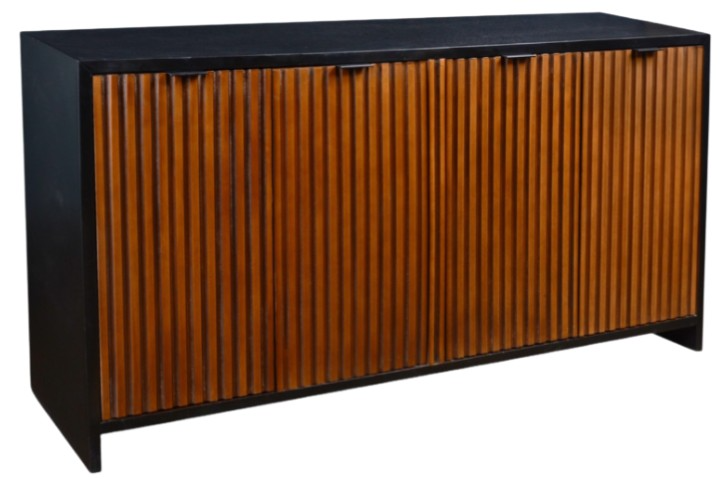 The Horizon Home® Carson 60" Console features a rectangular wood cabinet with a dark brown/black finish, four front doors with perforated or textured panels, and concealed internal shelving. Crafted from solid wood for durability, it ships fully assembled—ideal for living rooms or entryways.Read More