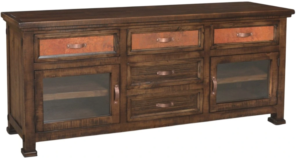 Crafted with solid wood construction, this piece features an authentic hand-hammered reclaimed copper top that adds rustic charm. Custom cast metal drawer pulls enhance its unique character, while full-extension ball bearing drawer glides ensure smooth functionality.Read More