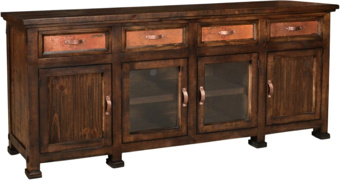 Crafted from solid wood, this piece features an authentic hand-hammered reclaimed copper top and custom cast metal drawer pulls. The drawers glide smoothly on full-extension ball bearing slides, while a multi-step lacquer finish enhances durability and depth. Sandblasted drawer fronts reveal the natural wood grain, creating a beautifully weathered appearance.Read More