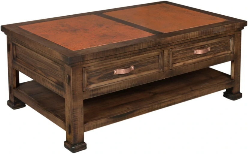 Solid wood construction. Authentic hand hammered reclaimed copper top. Cast metal custom drawer pulls. Full extension ball bearing drawer glides. The table comes with casters for ease of movement. Multi-step lacquer finish. Sand-blasted drawer fronts provide an exposed wood grain and weathered look.Read More