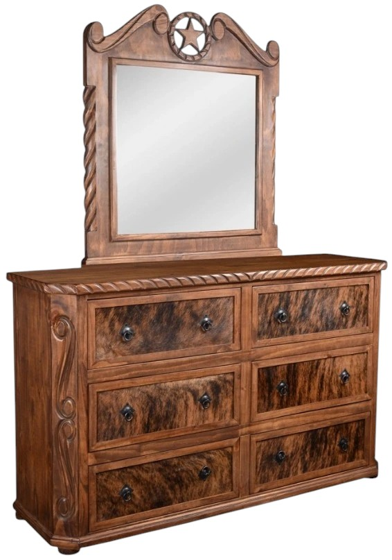 The Lasso Cowhide dresser and mirror blend rustic flair with refined craftsmanship. Featuring a striking star-accented mirror and detailed woodcraft throughout, this set enhances any western-inspired space. Six spacious drawers offer abundant storage, while the unique cowhide elements bring texture and personality to your bedroom decor.Read More