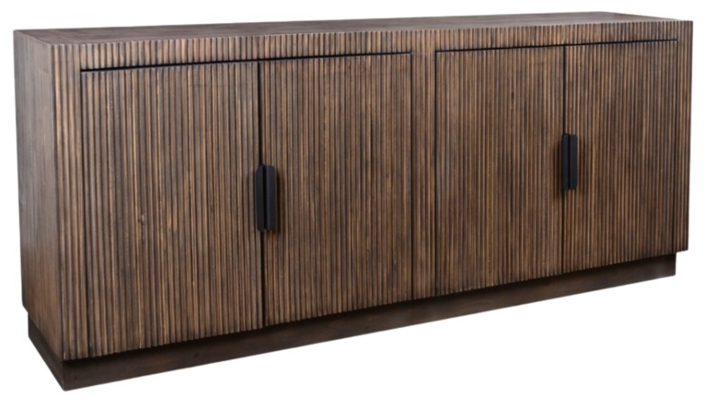 The Horizon Home® Monterrey 85" 4‑Door Console is an expansive wooden cabinet in black and brown finishes. Featuring four front doors with textured paneling and concealed internal shelving, it offers durable wood construction and perfect for media storage or entryway use.Read More