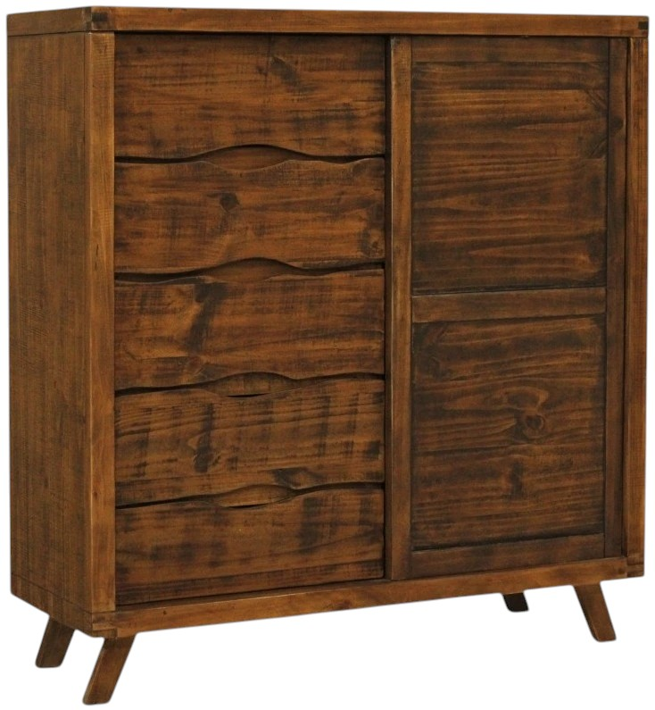 The Nativa Chest blends rustic character with practical storage, featuring a warm brown finish that highlights its farmhouse appeal. A sliding barn-style door reveals three interior shelves, while five smooth drawers offer ample organization. Its sturdy design makes it a functional and stylish addition to any bedroom.Read More