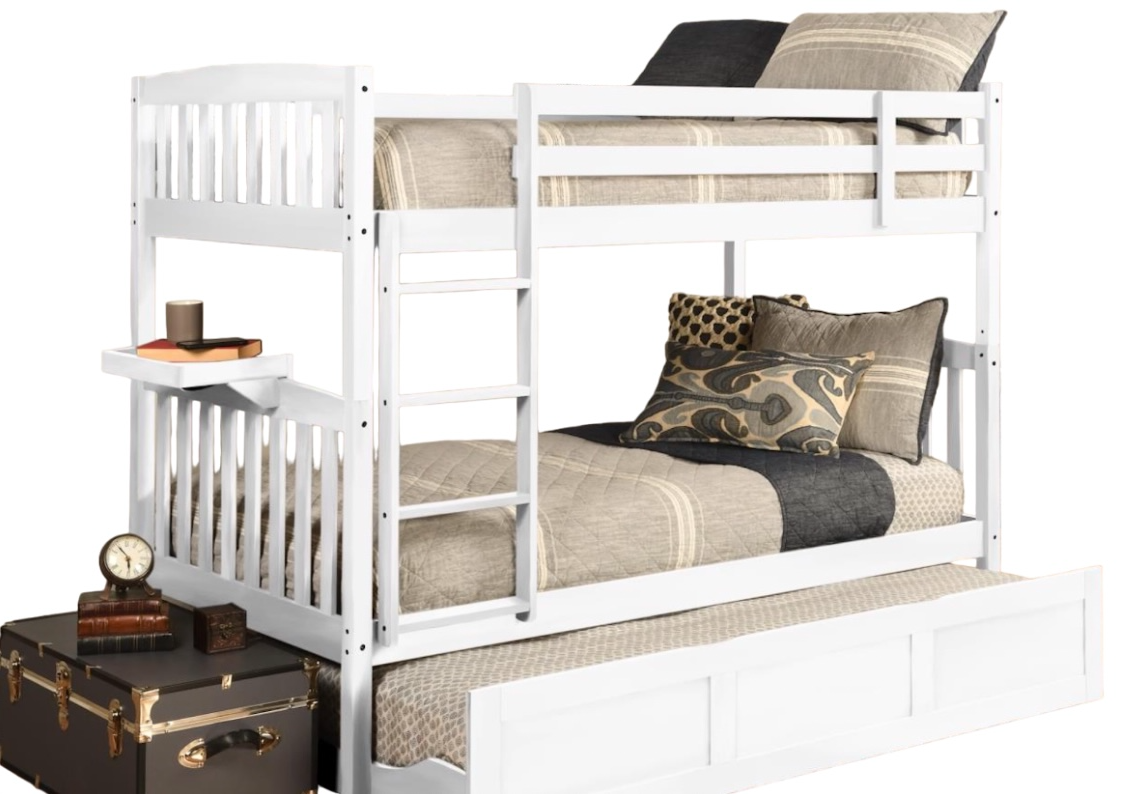 The Claire Bunk bed boasts clean lines and attractive angles. The White finish blends in with many color schemes in your home. This bed can be used as a Twin over Twin bunk or as separate Twin beds. Enjoy this hardwood sturdy bunk bed, this bunk bed will hold up to your lifestyle. This bunk bed includes an additional trundle bed perfect for guests and sleepovers. It also includes a detachable tray to hold remotes, books and those late night snacks.Read More