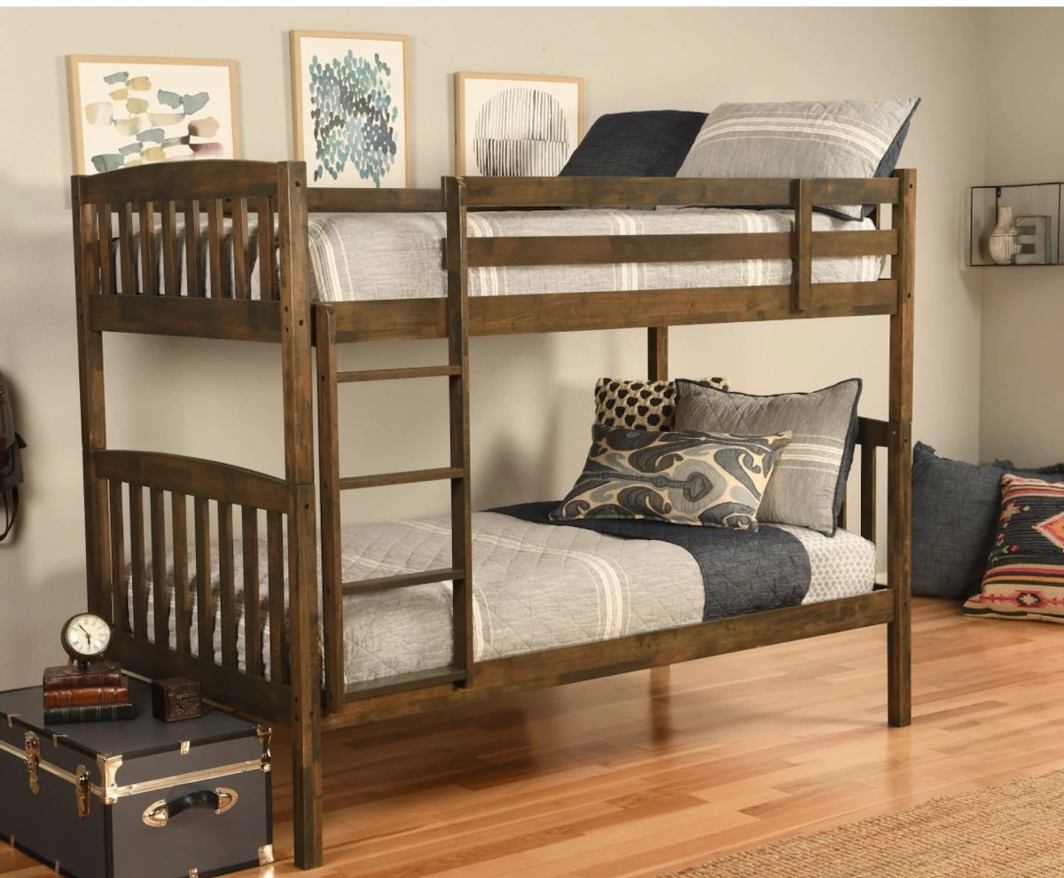 The Claire Bunk bed boasts clean lines and attractive angles. The Rustic Brown finish blends in with many color schemes in your home. This bed can be used as a Twin over Twin bunk or as separate Twin beds. Enjoy this hardwood sturdy bunk bed, this bunk bed will hold up to your lifestyle.Read More