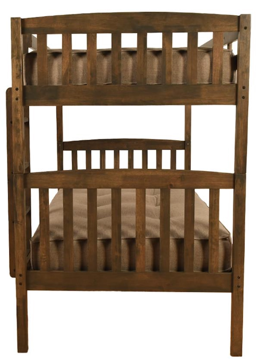 The Claire Bunk bed boasts clean lines and attractive angles. The Rustic Brown finish blends in with many color schemes in your home. This bed can be used as a Twin over Twin bunk or as separate Twin beds. Enjoy this hardwood sturdy bunk bed, this bunk bed will hold up to your lifestyle. This bunk bed includes storage drawers.Read More