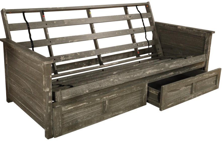 This full futon frame in weathered brown includes built-in storage drawers for added convenience. It easily switches between a sofa and bed, making it useful for daily seating or sleeping needs. A practical choice for saving space in apartments, guest rooms, or multipurpose areas.Read More