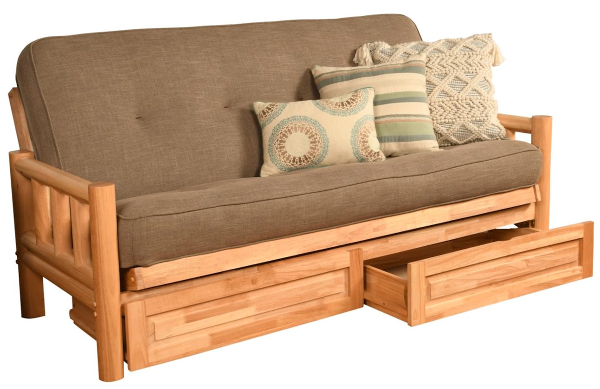 The timeless look of the round, log cabin style, solid hardwood arms of this full-size futon frame with storage drawers is a perfect fit in your mountain retreat, family room, or the man cave in your home decor.Read More