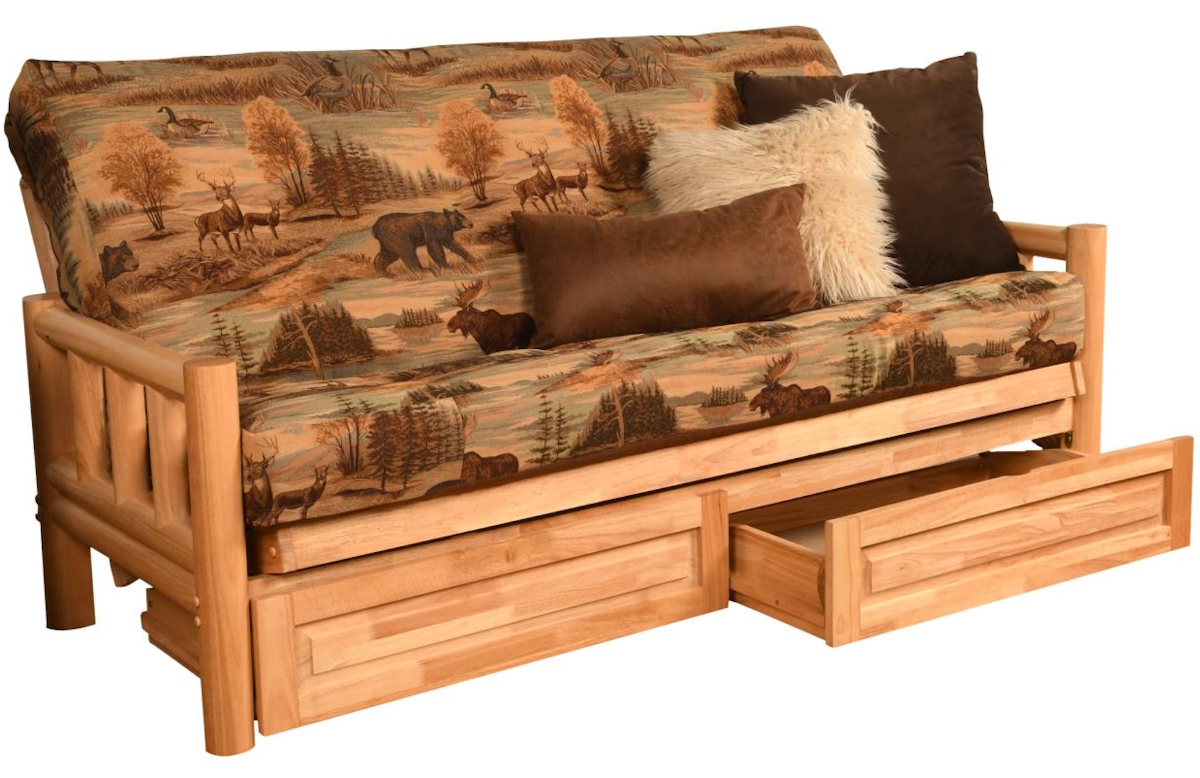 The timeless look of the round, log cabin style, solid hardwood arms of this full-size futon frame with storage drawers is a perfect fit in your mountain retreat, family room, or the man cave in your home decor.Read More
