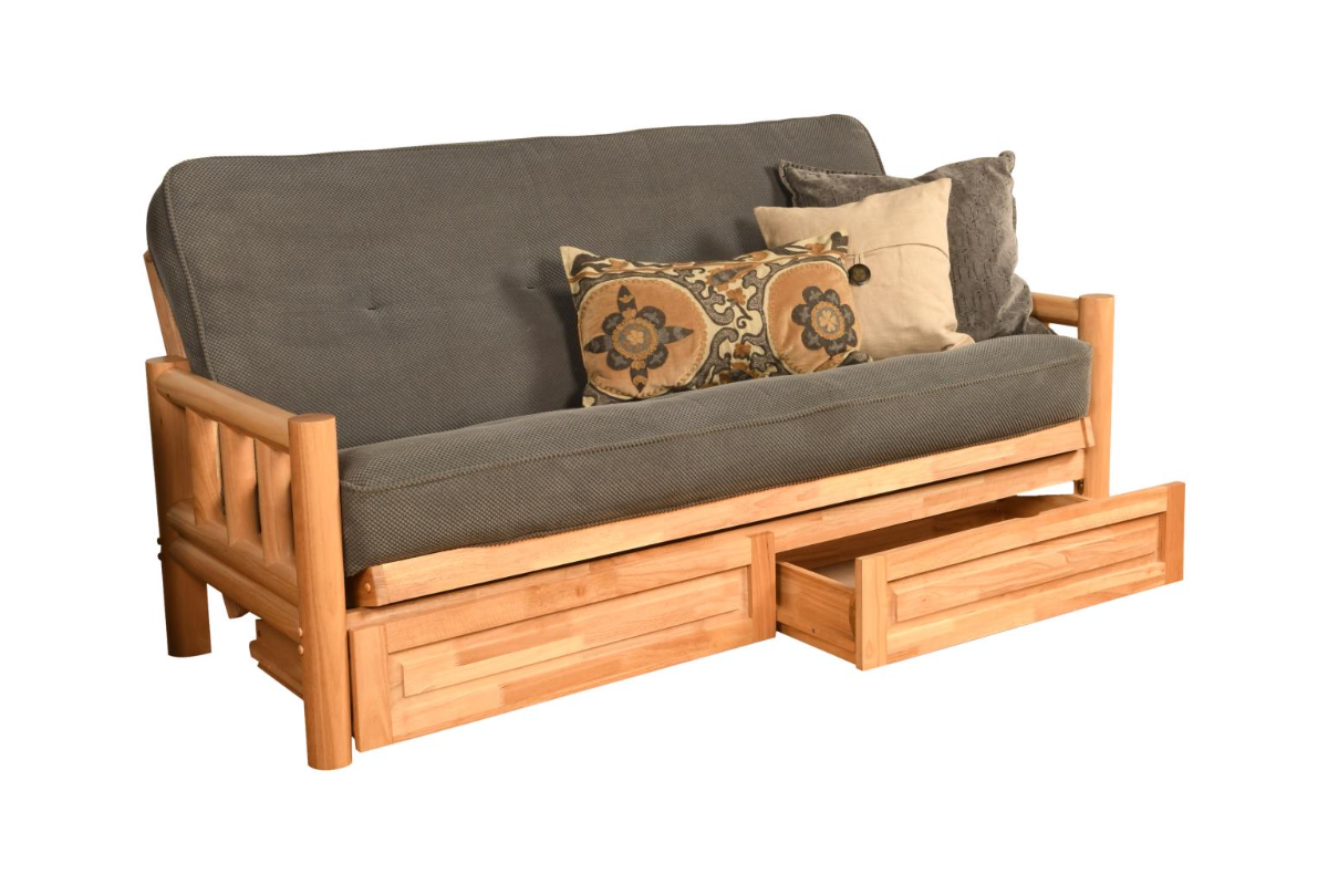 The timeless look of the round, log cabin style, solid hardwood arms of this full-size futon frame with storage drawers is a perfect fit in your mountain retreat, family room, or the man cave in your traditional or rustic style home decor. With its beautiful natural wood grain finish and drawers for extra storage, this futon is sure to be a lasting treasure.Read More