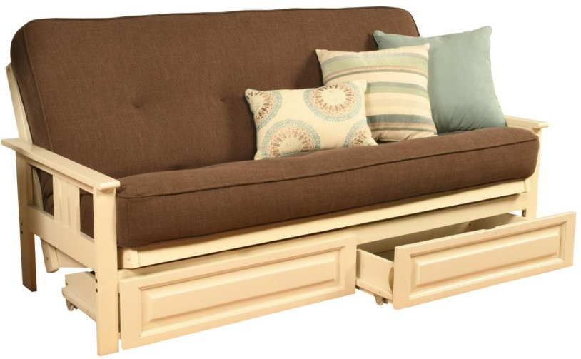 This futon frame has two optional drawers for out-of-sight storage