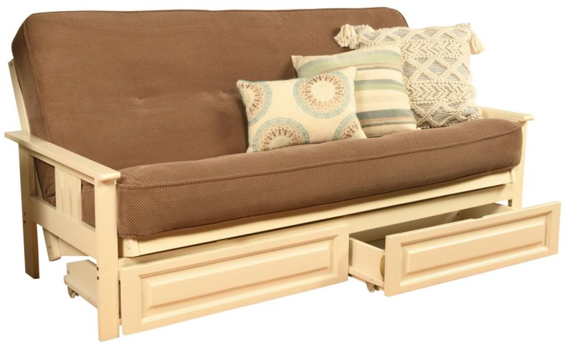 This futon frame has two optional drawers for out-of-sight storage