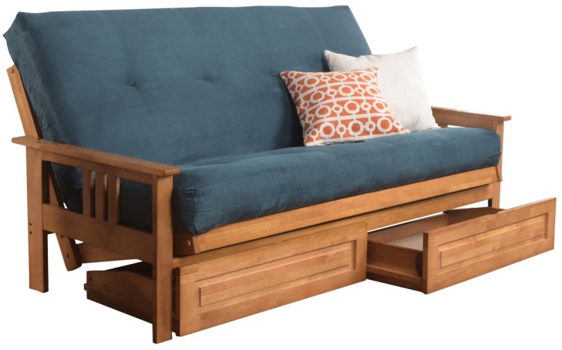 This futon frame has two optional drawers for out-of-sight storage