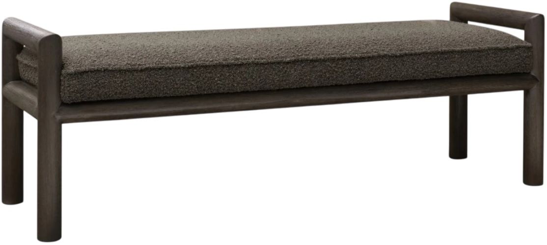 Distinctive design pairs thick rounded posts with low arms and a plush boucle cushion