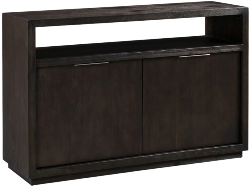 This Oxford Graphite 54" Media Console from Modus Furniture makes a striking first impression with bold proportions, crisp, modern lines, and a weathered finish. Smartly accented with top-mounted nickel plated pulls, tempered glass, and a floating plinth base.Read More