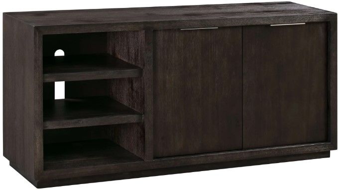 This Oxford Graphite 64" Media Console from Modus Furniture makes a striking first impression with bold proportions, crisp, modern lines, and a weathered finish. Smartly accented with top-mounted nickel-plated pulls, tempered glass, and a floating plinth base.Read More