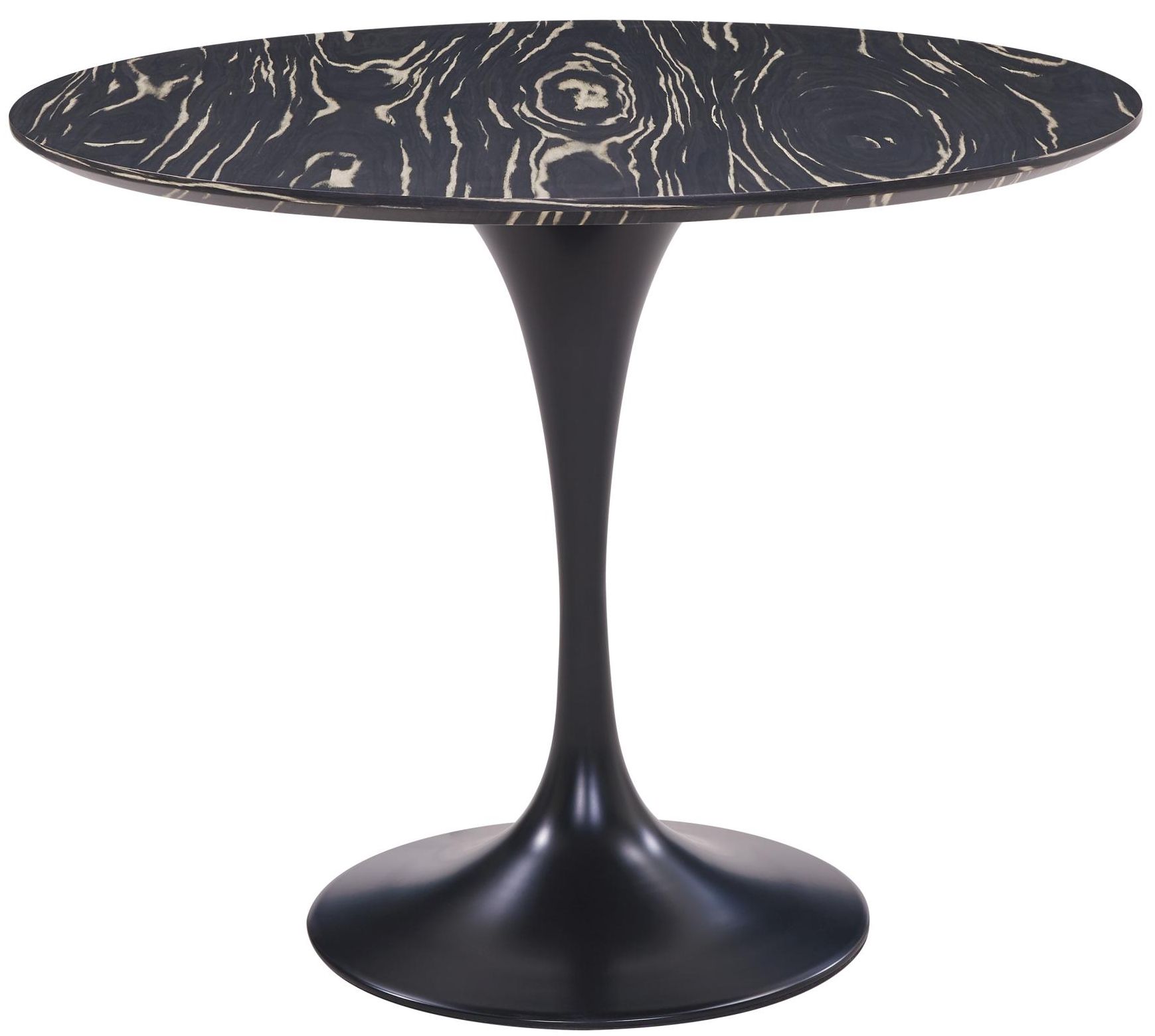 Macassar Ebony-inspired veneer provides a Modern aesthetic dining table with a painted steel pedestal frame. Comfortably seats four.