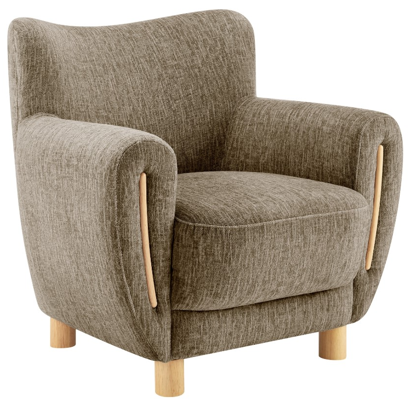 The classic wingback chair is elevated in whimsy contours. In Bellamy, the rounded shape is punctuated by graceful fabric and charming décor such as the inlay wood and nubby feet in natural tone. Easy Assembly. Available in Pasadena Beige and Pasadena Taupe.