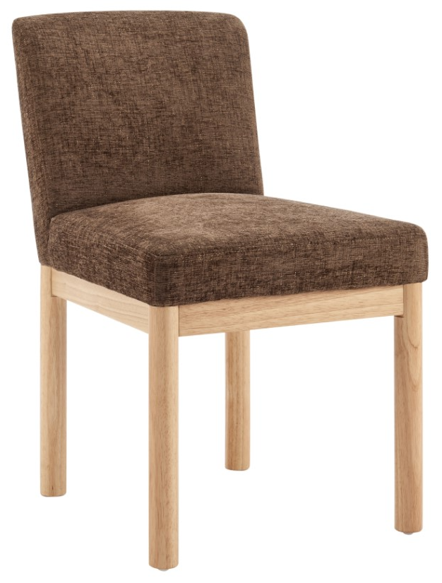 Create a modern ambiance by adding a touch of charming elegance to the space. Incorporating the Bloomfield chair style infuse a sense of calm and nature. In low-height back, decorated with soft, chenille fabric in Dark Brown tone and natural finish frame. The chair also features rounded wooden legs that's charming. Easy-care polyester fabric has been tested and approved for high-traffic family rooms. Easy Assembly. Available in Santana Cream and Santana Dark Brown. Fabric is 100% PES.