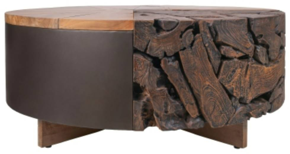 Artisanship is the highlight for the Brizo table series. Visually intriguing, the reclaimed teak root is skillfully formed to create a 39.5" width living room table. A coated steel base in Nightfall Black adds a sleek appeal to the overall piece while wooden legs secured the entire table. Plastic glides are installed on the legs for safety and stability. Matching side table is available and sold separately. All natural products, live edge, petrified & reclaimed wood will vary either in shape, size, color, & texture. Crack, holes, wood knots are expected, inherent characteristic.