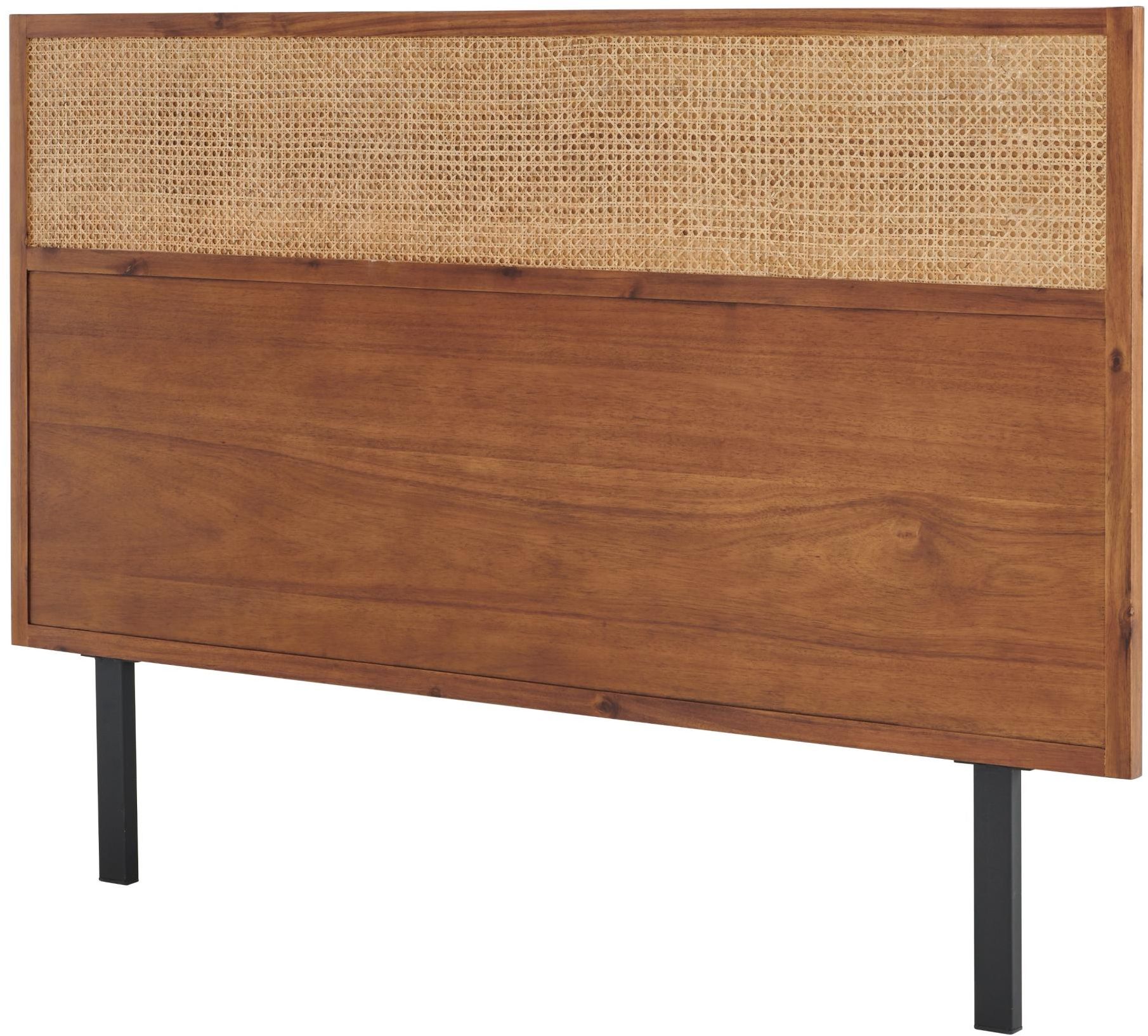 Modern with a minimalist profile, the Caine Rattan Collection highlights a headboard constructed of cane webbing panel and Acacia wood veneer on black powder-coated steel legs.
