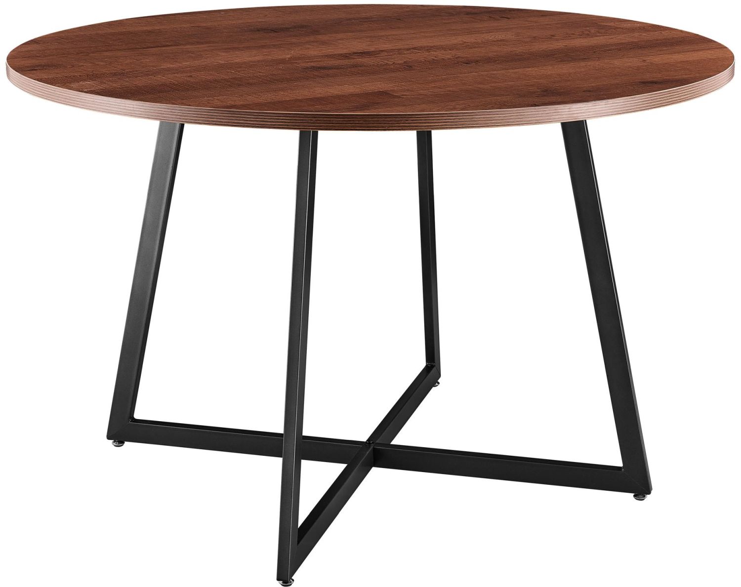 Modern Minimalist - round shape 48" tabletop in sleek brown melamine finish is complemented on angular metallic gunmetal powder-coated steel legs.