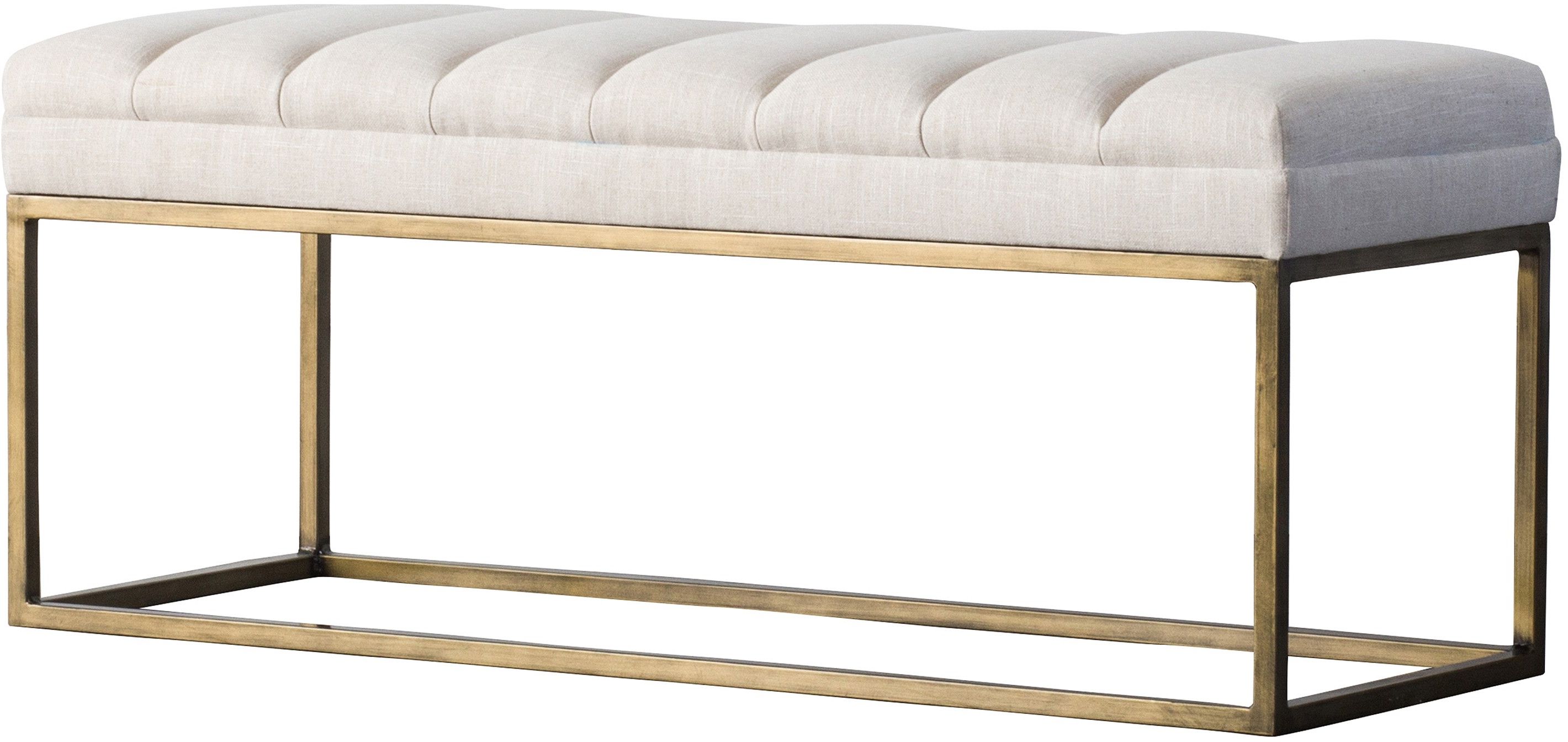 Elegant modern bench, featuring plush channel pleating with streamlined brushed gold steel frame.