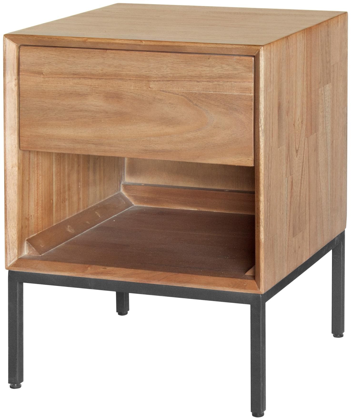 Refresh the look of your bedroom with our clean-lined Hathaway Collection, which is designed to work with decorating styles from modern to transitional. The nightstand is crafted from solid Mindy wood with the Newton Brown finish, and it sits on steel legs.Read More