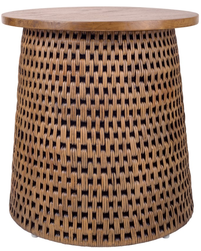 Decorative End Table that's statement-making! This basket weave pattern frame and solid Mindi wood round top highlights the natural tone with an upscale design and appearance. Indoor only. Fully Assembled. Available in Canary Brown with Black finish.