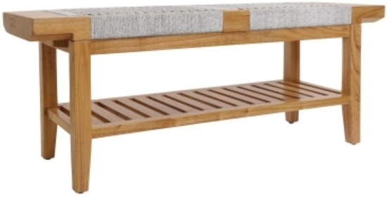 Delightful as an accent where it's needed most. The bench features intricately woven rope design encasing the seat frame for an appealing prime focus. The bottom frame features slatted wooden base for open storage area. Plastic glides are included for protection.