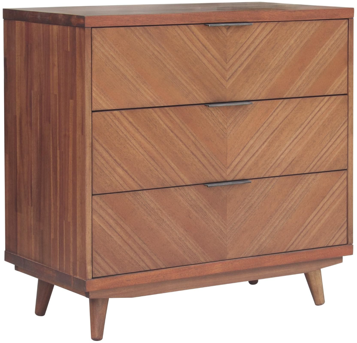 Modern Mid-Century 3-drawer dresser, designed for a timeless appeal, featuring stylish chevron pattern front panels on classic splayed legs, constructed of solid Mango wood in gorgeous brown tone.