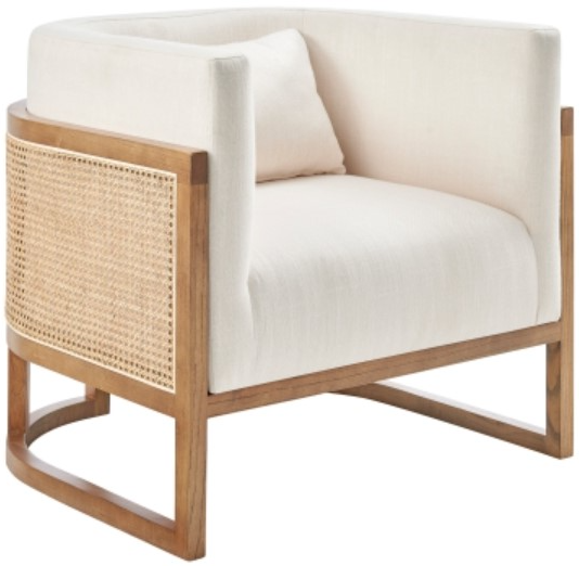 Floating style cantilever base is of solid wood. Upscale vibe living room furniture - this barrel style chair offers sophistication with its curved shape and fine detailing in rattan and solid nettle wood frame. One lumbar pillow is included. Plastic glides are also included for safety and stability.