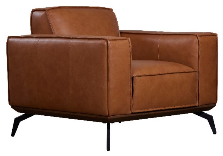 Complementing the plush leather is the espresso wood trim, which adds a touch of timeless elegance. This darker accent works harmoniously with the caramel tones, creating a cohesive and inviting aesthetic. The set's design is further enhanced by the flared black metal legs, which introduce a mid-century modern element to the ensemble. This fusion of classic materials with modern design results in a versatile furniture set that could be the centerpiece in a variety of interior decor styles, from traditional to contemporary. The Carina set, therefore, is not just a piece of furniture, but a statement of style that could elevate the ambiance of any living space.