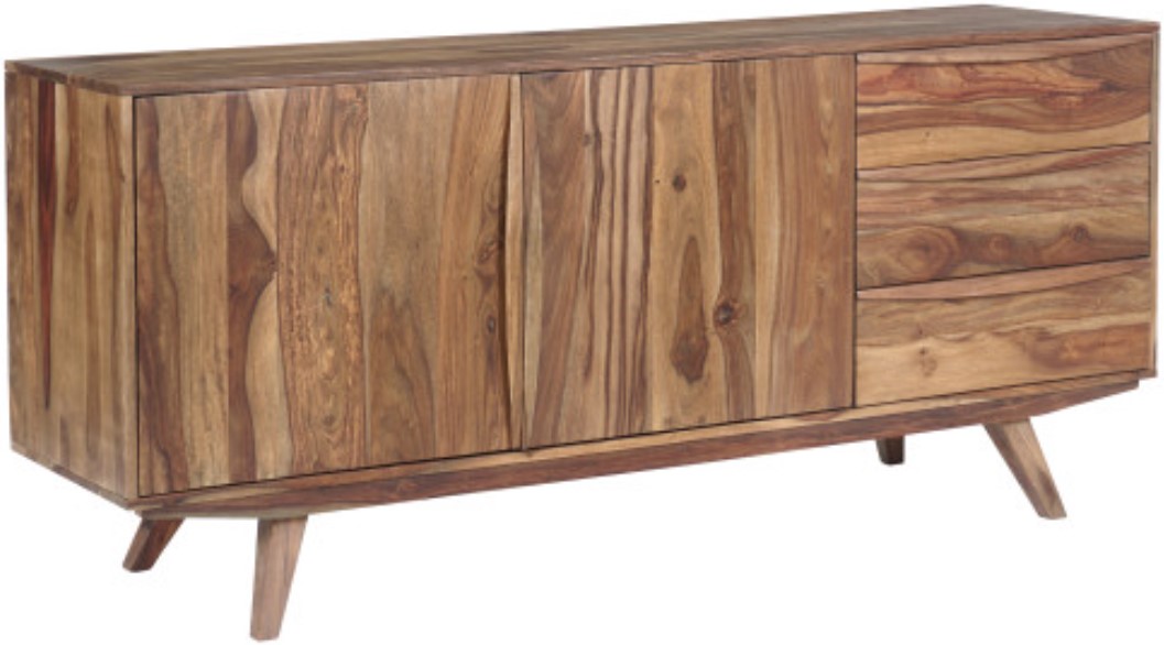 The mid-century modern solid sheesham Fusion Sideboard features three drawers and two doors with an interior shelf. Perfect for dining storage, it is an heirloom quality piece built to stand up to modern life. With chic flaired legs and curved drawer pulls, the craftmanship and beauty of this solid wood collection is truly evident.Read More