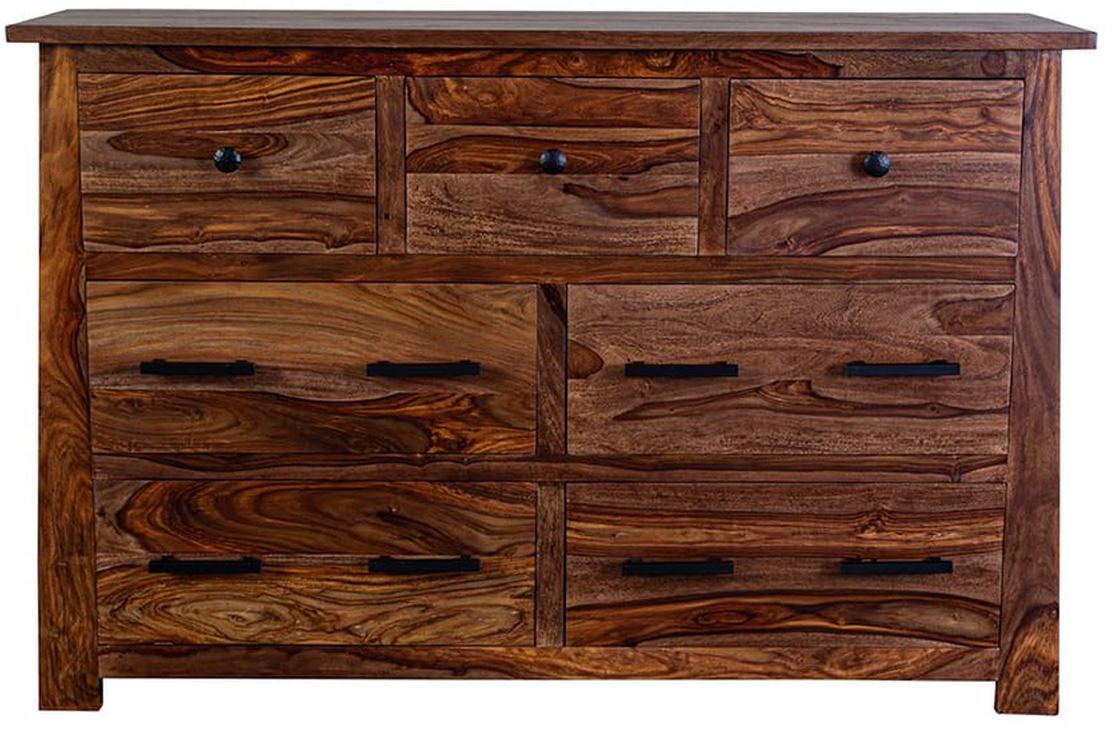 The solid wood Kalispell Collection is an homage to the American Arts & Crafts movement. Handmade in India by artisans, this collection celebrates quality craftsmanship and the beautiful, rich grain of sheesham wood. Hammered black metal hardware and tapered lines add architectural detail to this classic wood collection. The harvest finish is a rich, honey-tone which accentuates the beautiful grain variation of the Sheesham Wood.