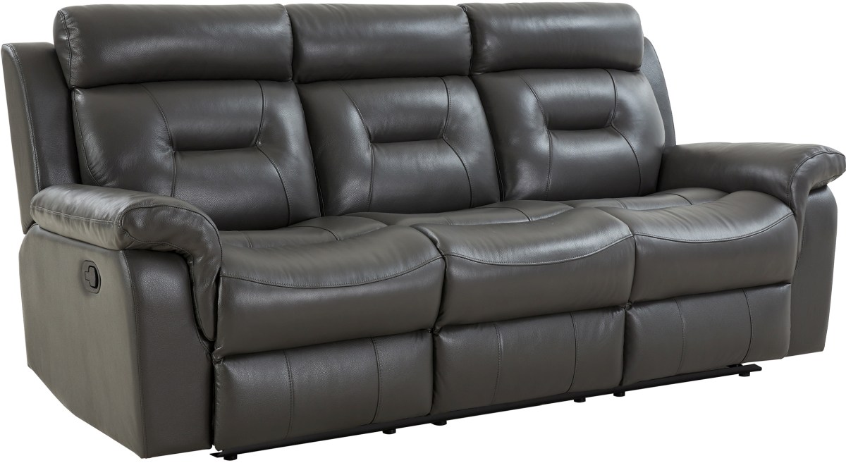 The contemporary Paolo Reclining Motion Sofa is upholstered in elegant gray top grain leather with leather match poly and features comfy pillowtop padded arms and headrests, chaise footrests and manual reclining seats. A plush spot to relax at the end of a long day.Read More
