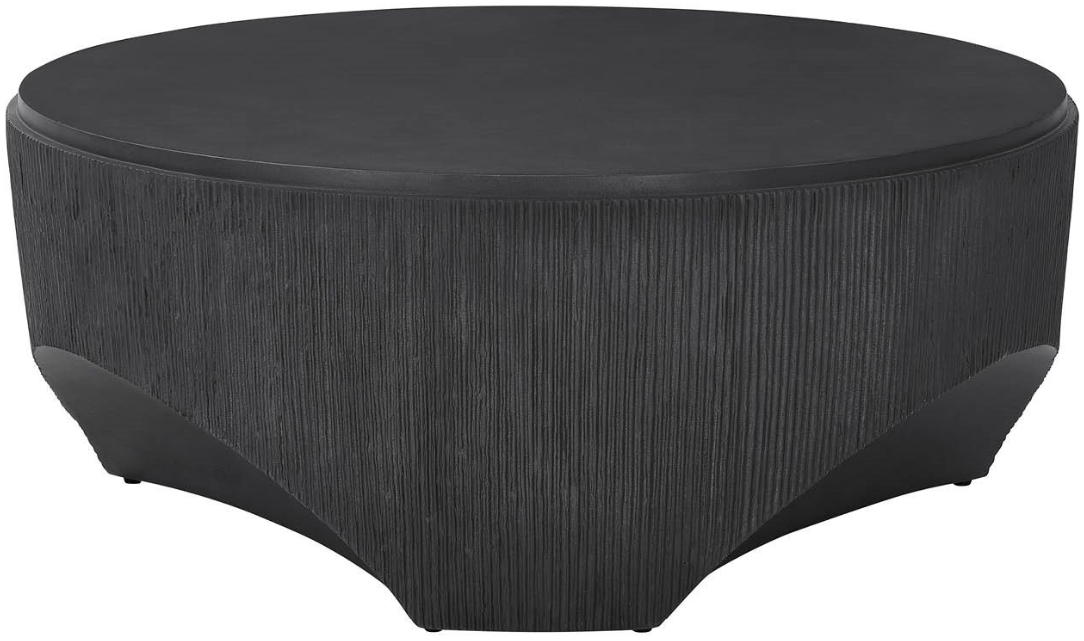 The cinder cocktail table showcases innovative glass-reinforced concrete in sculptural round form with concave base carveouts. Distinctive reeded sides create dramatic texture and visual weight, representing the collection's most contemporary expression while maintaining refined aesthetic appeal.Read More