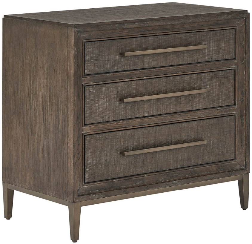 The Montclair nightstand showcases three drawers with signature cocoa case and embossed cocoa fronts, elevated on a sleek smoked gold metal base. Integrated electrical features provide modern convenience while refined proportions complement contemporary bedroom settings.Read More