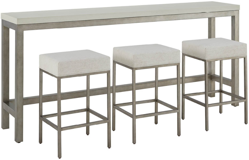 The Oasis console with stools offers a sophisticated 82-inch design in antique nickel finish with a white quartz top and includes three matching stools upholstered in Nomad Snow fabric. This versatile piece with 36-inch console height and 26-inch stool height creates a perfect spot for dining, working, or entertaining in your coastal home.Read More