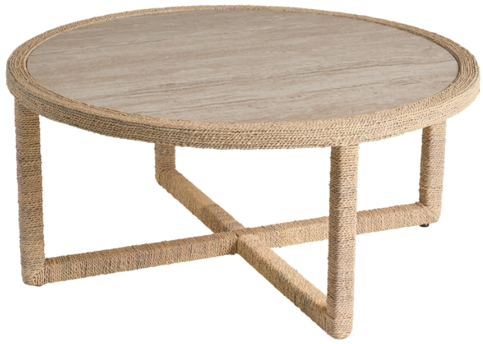 The abaca cocktail table is wrapped in natural abaca fiber with a travertine beige stone top, bringing organic texture and sophisticated materials together. This 40-inch round cocktail table with 18-inch height creates a centerpiece that perfectly embodies the relaxed refinement of coastal living.Read More