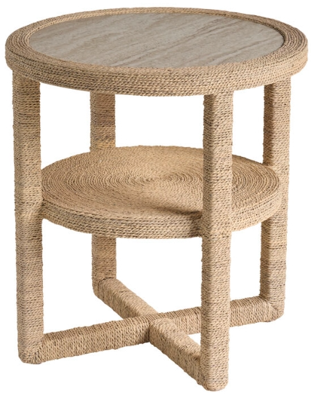 The abaca side table is wrapped in natural abaca fiber with a travertine beige stone top and features a useful shelf for storage or display. This 22-inch round side table with 24-inch height creates a versatile accent piece that brings texture and warmth to your coastal home.Read More
