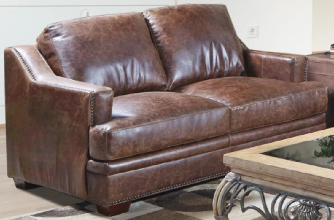 The USA Premium Leather Furniture Ancient Brown Loveseat features a clean silhouette with a track arm and nail head detailing. The Ancient Brown leather offers a crackle effect that will deepen in character over time.Read More